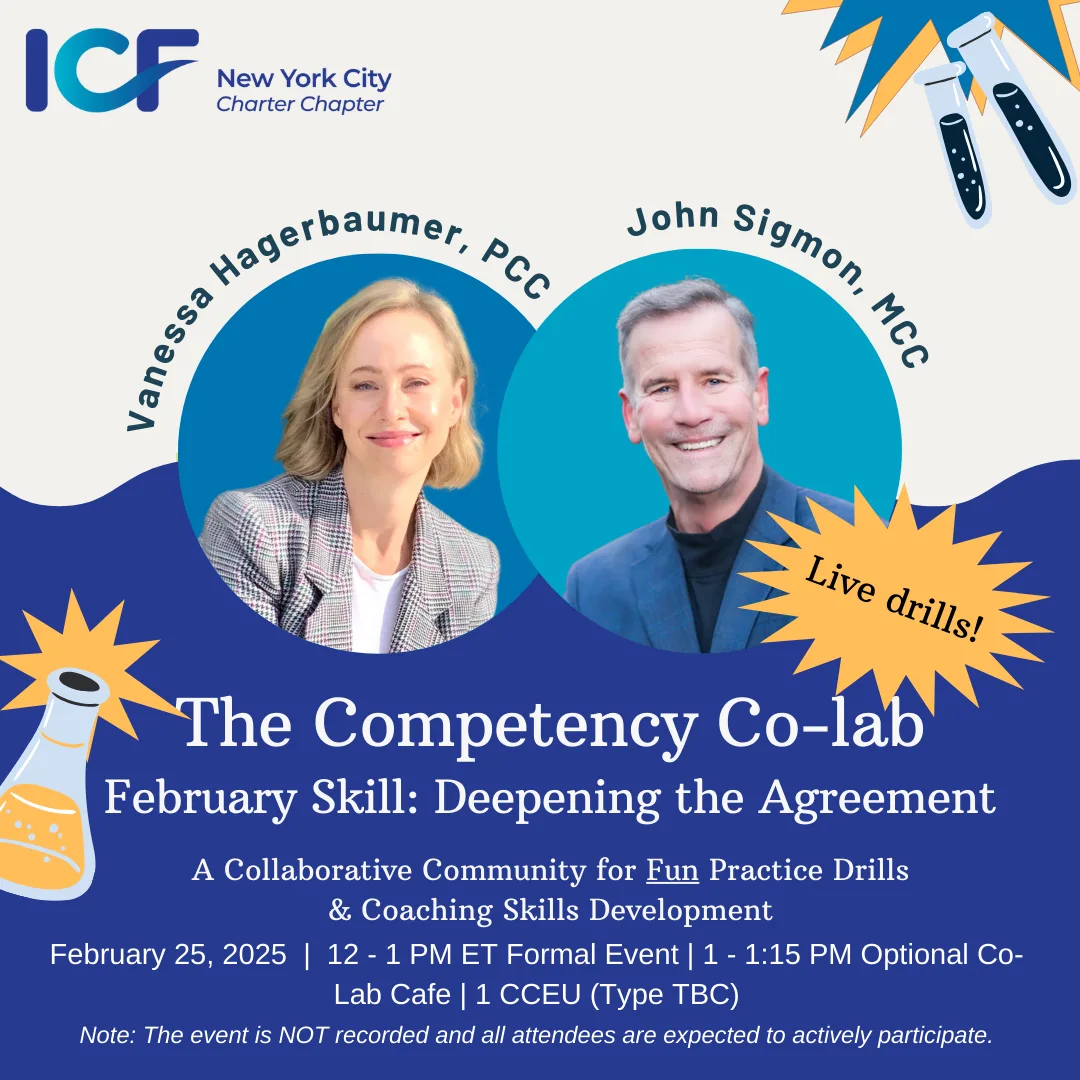 Welcome to the Competency Co-Lab, a monthly series for coaches to elevate their mastery of the ICF Core Competencies. Experience structured practice drills, interactive learning, and a supportive community. The Competency Co-Lab bridges theory and practical application, so you can seamlessly integrate your learnings into your coaching practice.